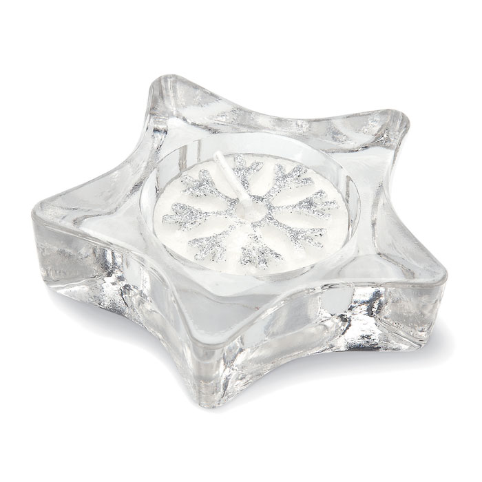 Bougeoir en verre en forme d’étoile dans une boîte en argent avec couvercle transparent et ruban décoratif. Bougie chauffe-plat incluse.