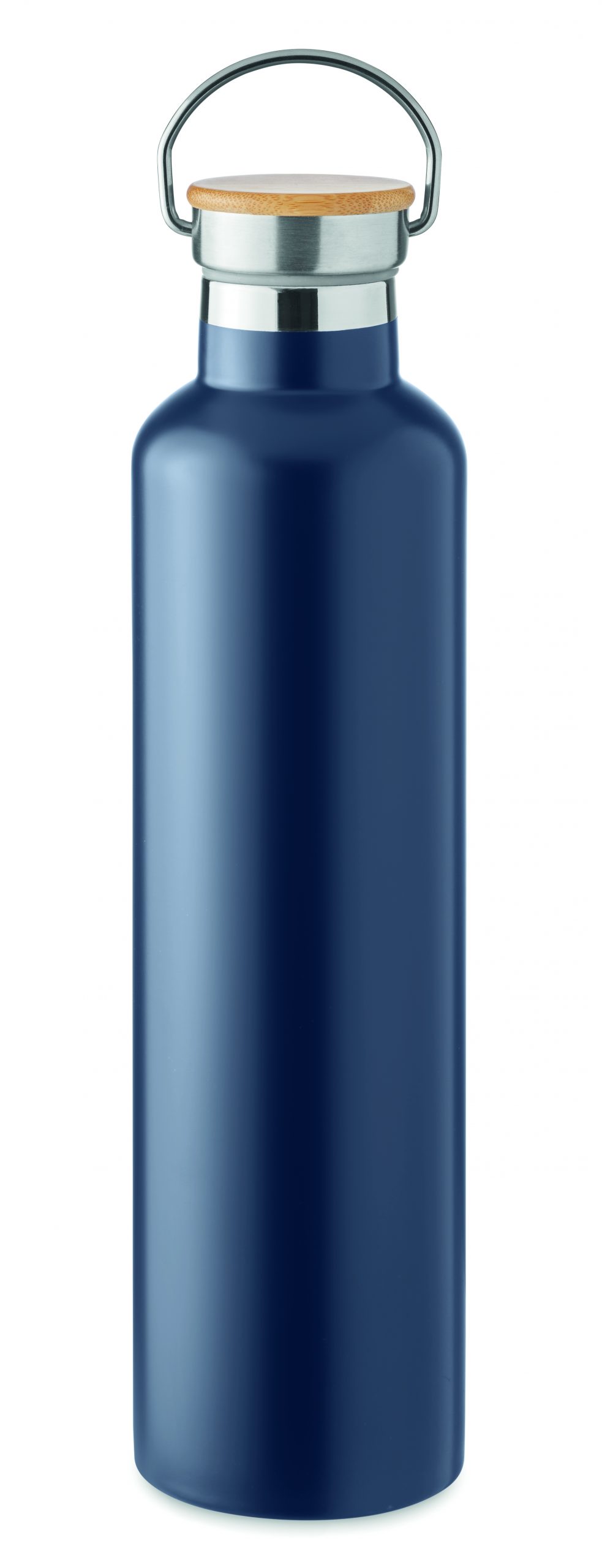 Bouteille isolante sous vide à double paroi en acier inoxydable avec couvercle en bambou et poignée de transport. Capacité : 1L. Le bambou est un produit naturel, et présente de légères variations de couleur, de décoration et de tailles.