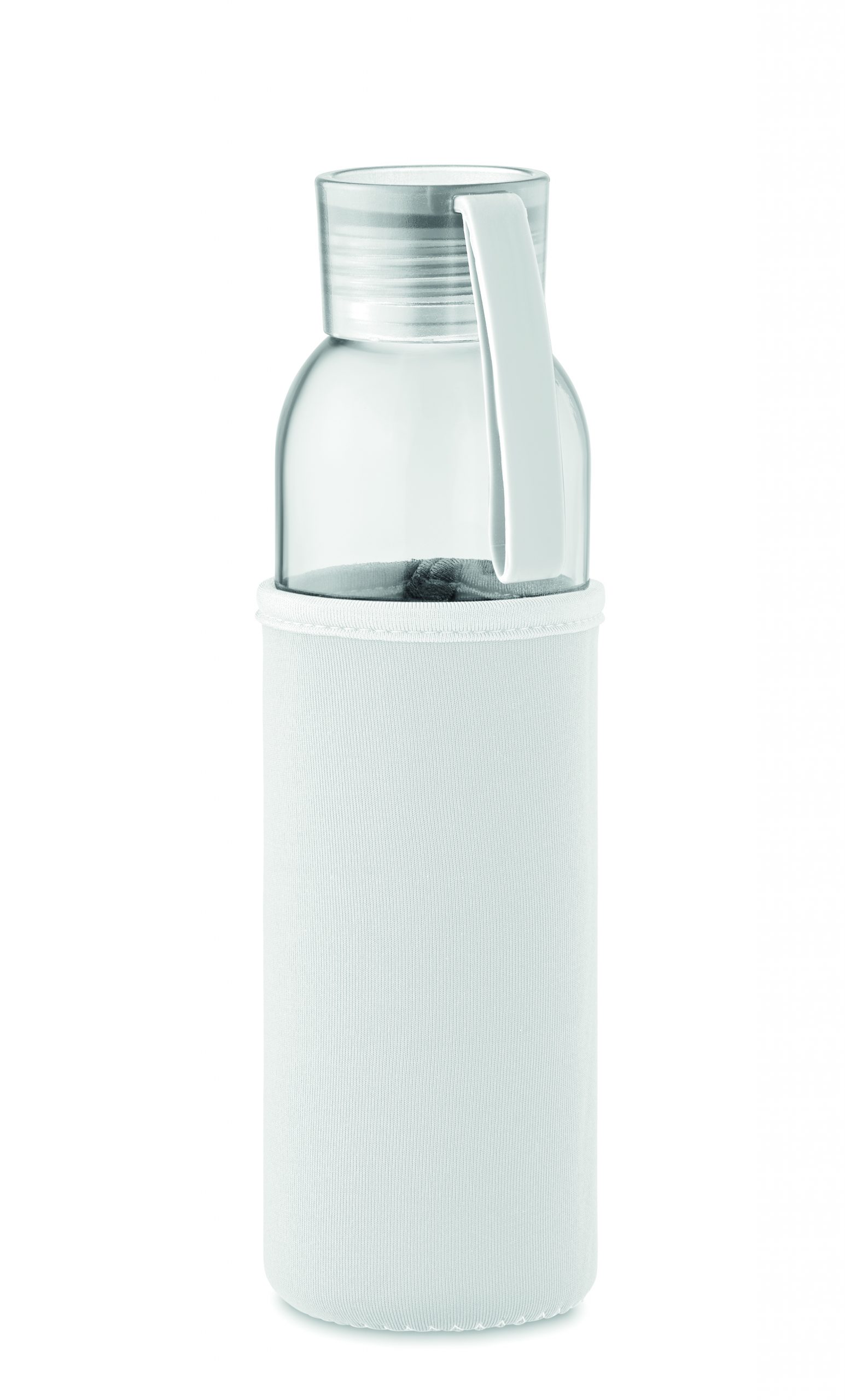 Bouteille en verre recyclé avec pochette en néoprène et couvercle en PP avec cordon en silicone. Anti fuite. Capacité : 500 ml.