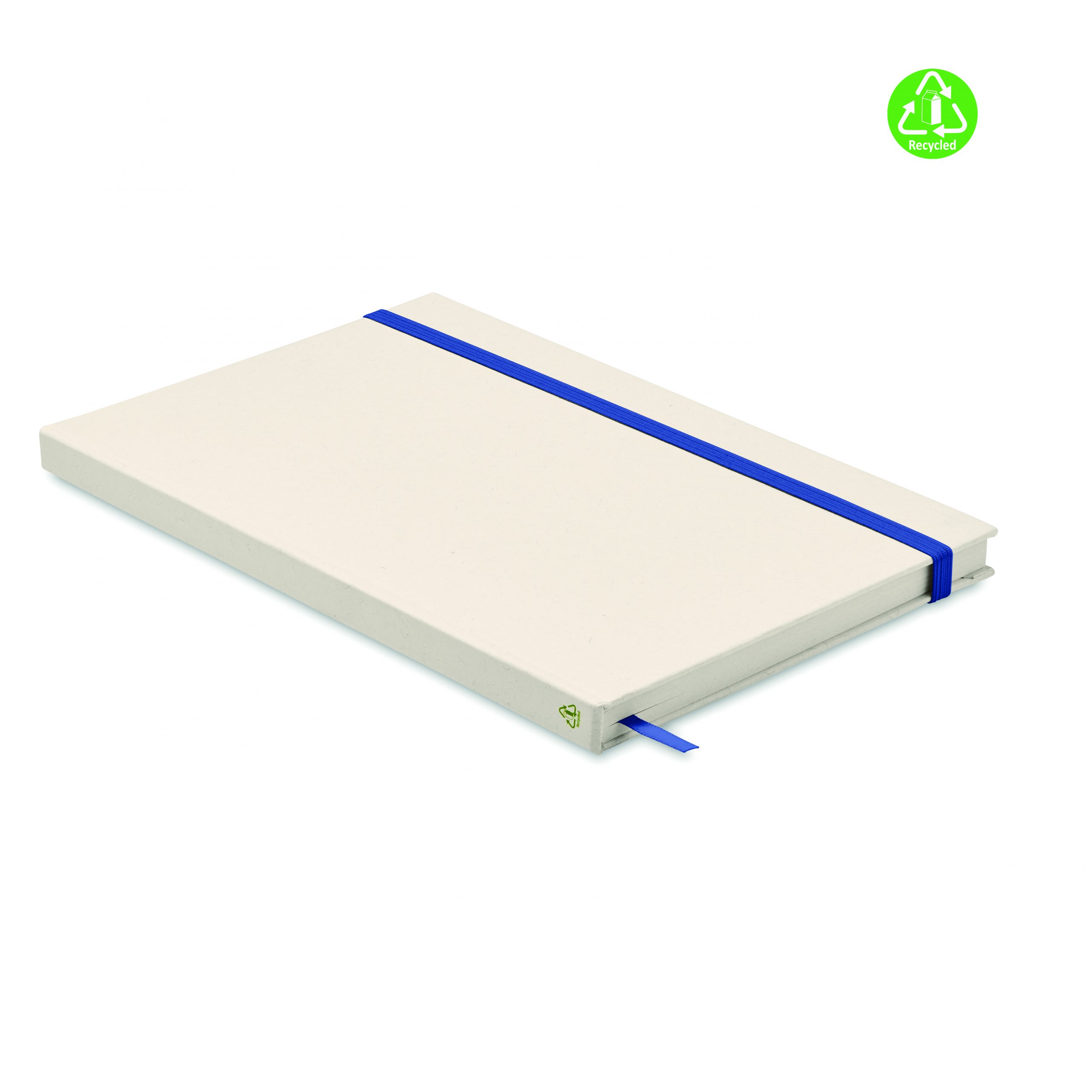 Cahier A5 avec couverture rigide et 160 pages lignées (80 feuilles 80 g/m²) en carton de lait recyclé à 70 % et en papier recyclé à 30 %. Reliure cartonnée. Fermeture élastique, ruban marque page.