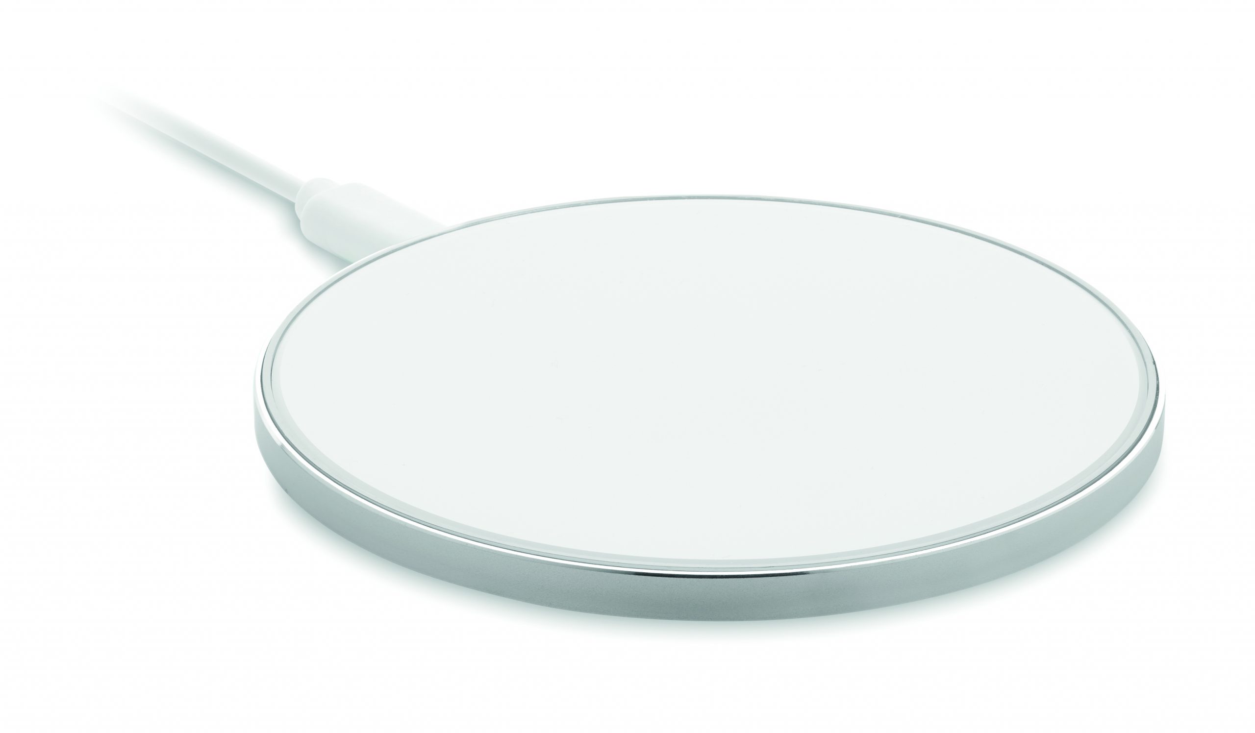 Chargeur sans fil en aluminium 10W avec verre sur le dessus. Lumière bleue lors de la charge. Sortie : DC 9V/1.1A. Compatible avec les derniers androïdes, iPhone® 8, X et plus récents.