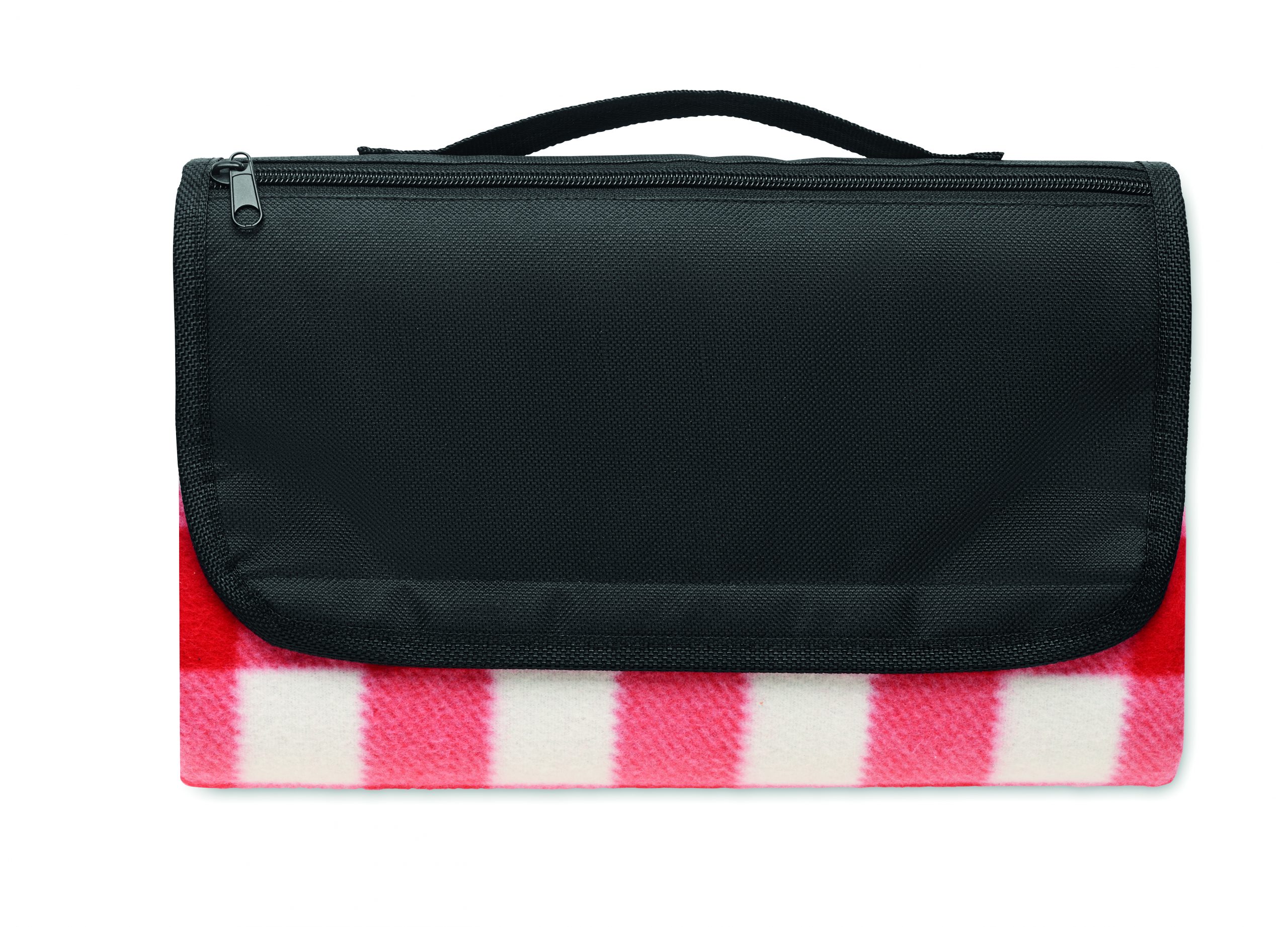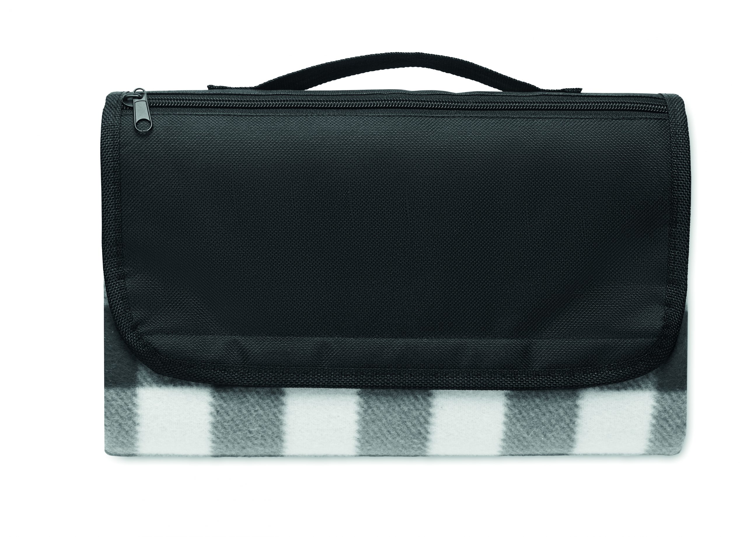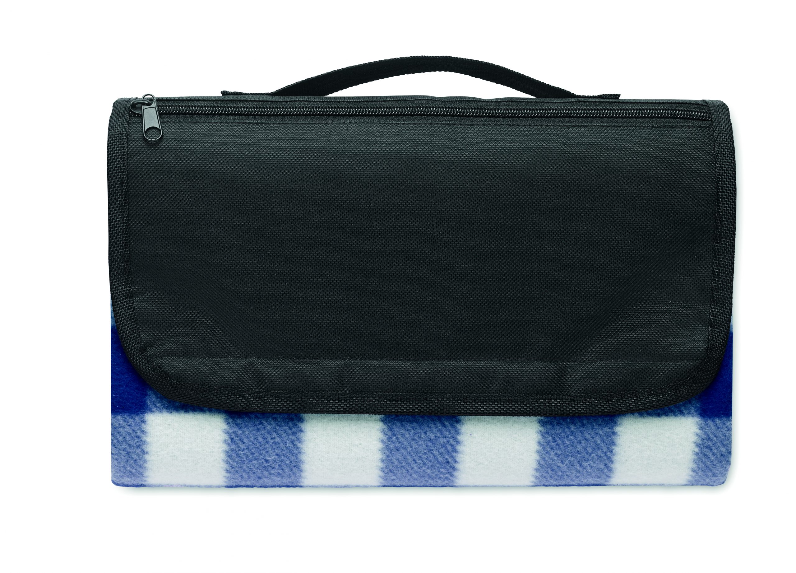 Couverture de pique-nique pliable en polaire RPET 150 gr/m² avec revers PEVA enduit résistant à l’eau. Comprend une poche frontale à fermeture éclair et une courte sangle de transport.