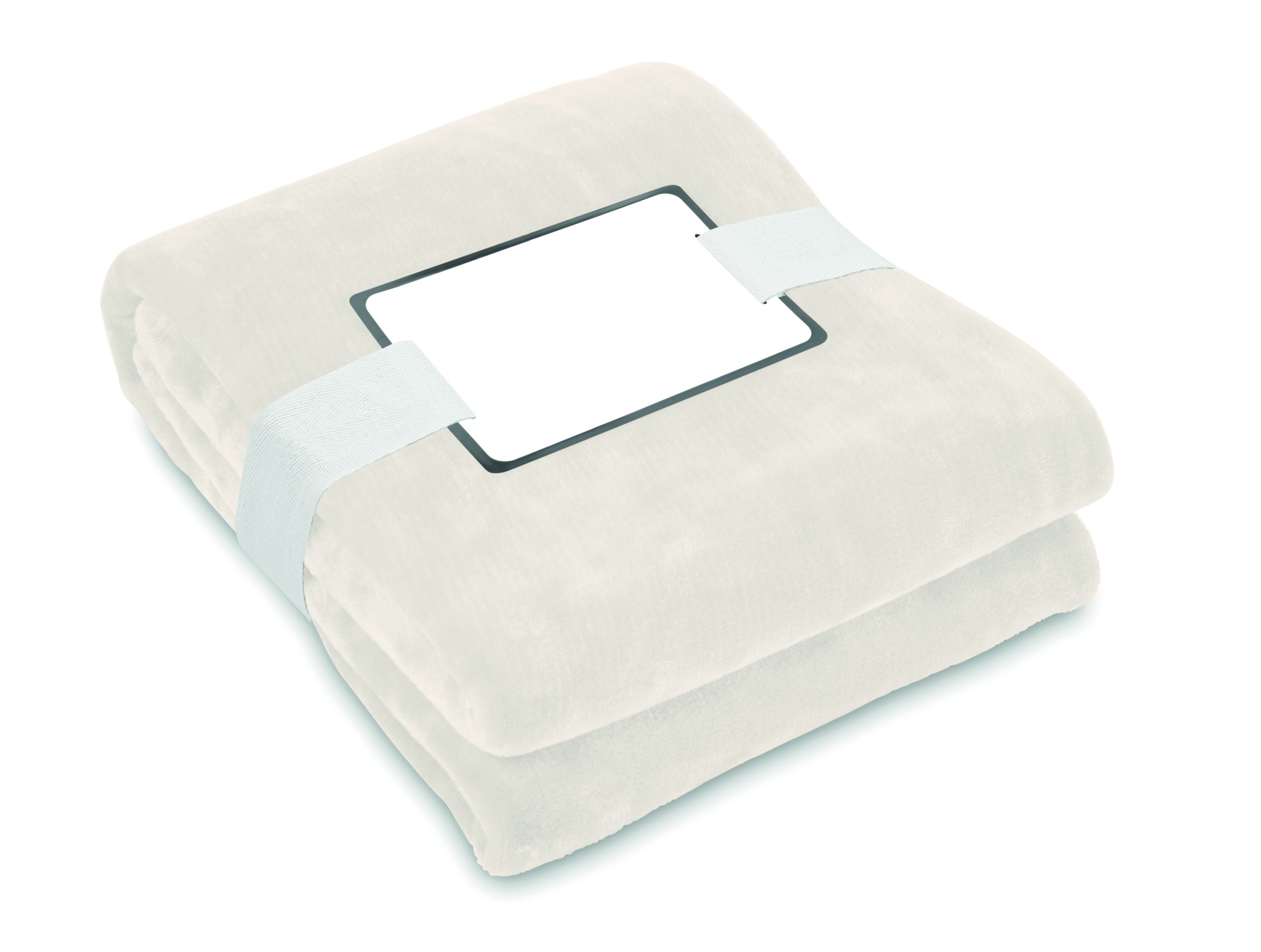 Couverture en polaire flanelle RPET 280 gr/m² enveloppée d’un ruban et d’une carte imprimable.