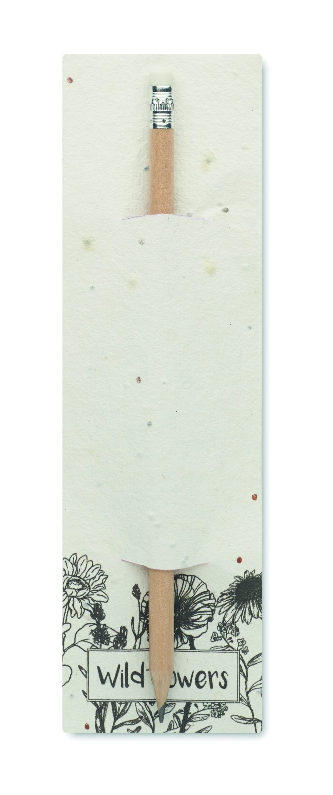 Crayon à papier en bois naturel avec gomme. Présenté dans une pochette de graines en papier (fleurs sauvages).