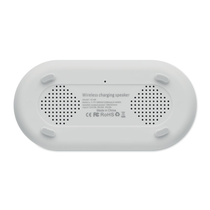 Haut-parleur 4-en-1 sans fil avec chargeur 15W et haut-parleur 5W en ABS avec station météo et lumière ambiante. Réveil. Affichage de l’heure et de la température. Batterie Li-Iin intégrée : 1200 mAh. Autonomie d’environ 7 heures.