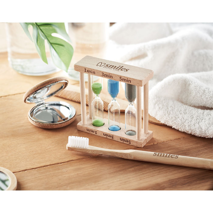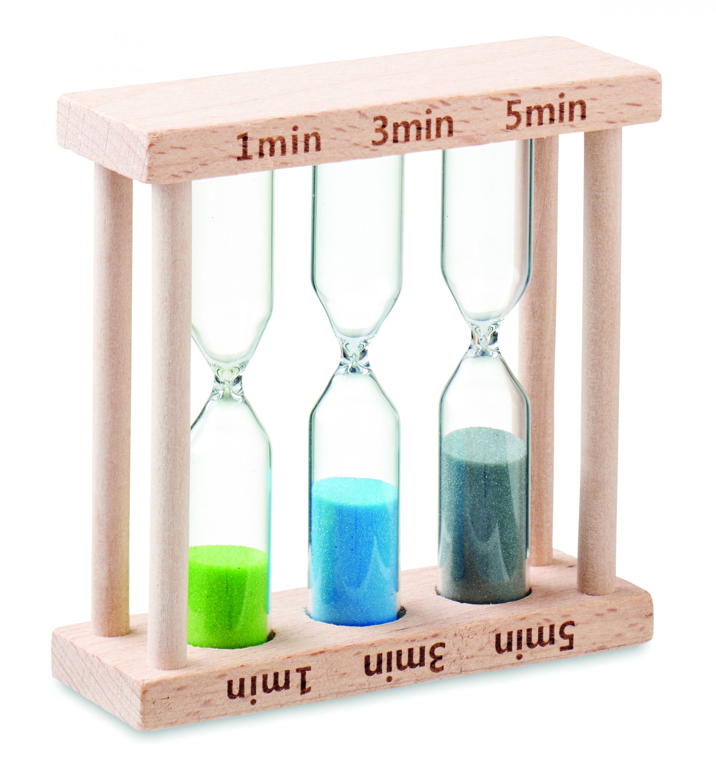 Jeu de 3 sabliers sur socle en bois avec 3 minuteries différentes (environ 1, 3 et 5 minutes).