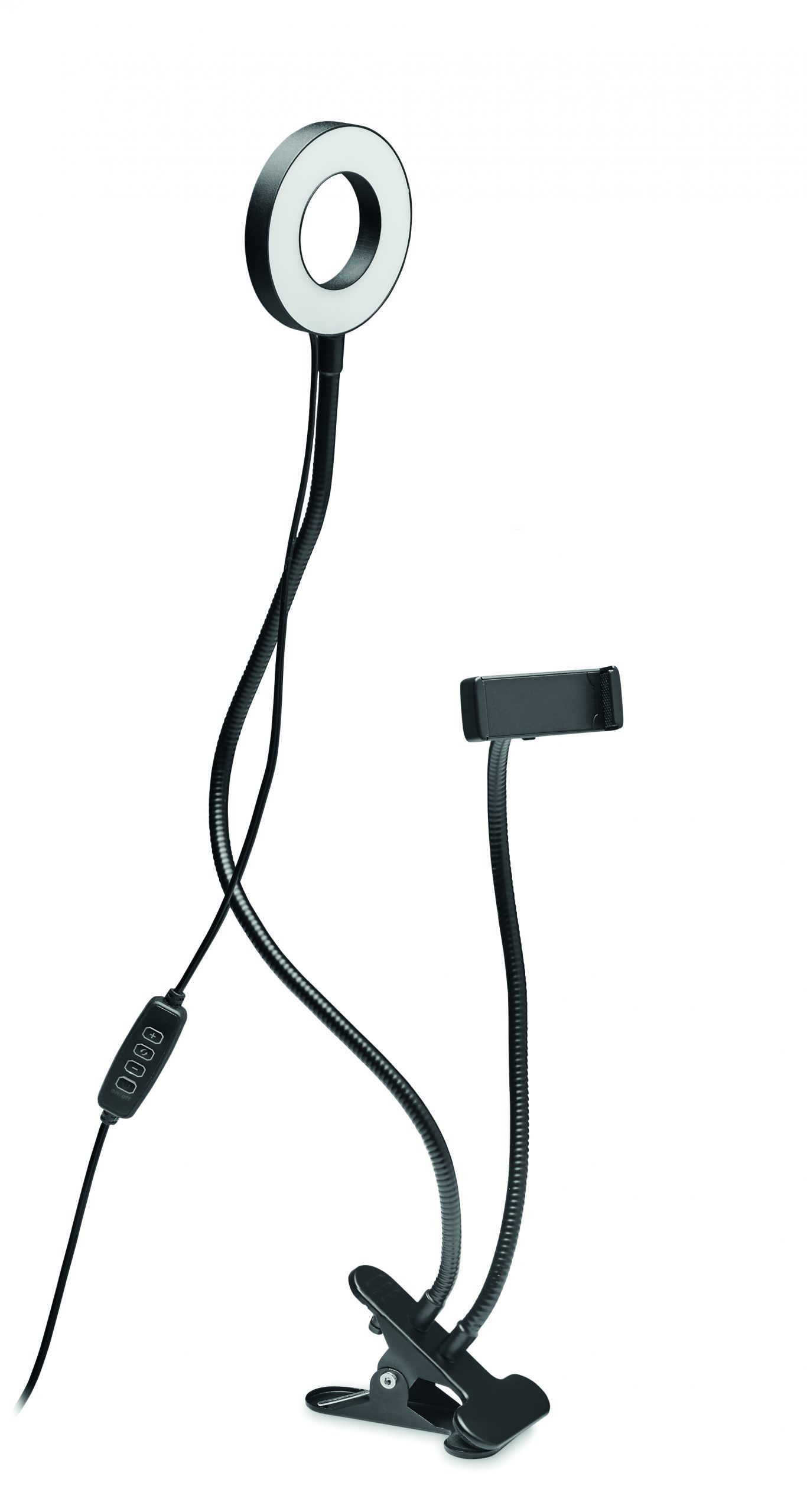 Anneau lumineux pour selfie portable de 24 cm avec support pour téléphone et clip. Idéal pour le tik-tok®, le live-streaming, la diffusion et la photographie. Lumière blanche, chaude, avec 3 niveaux de luminosité.