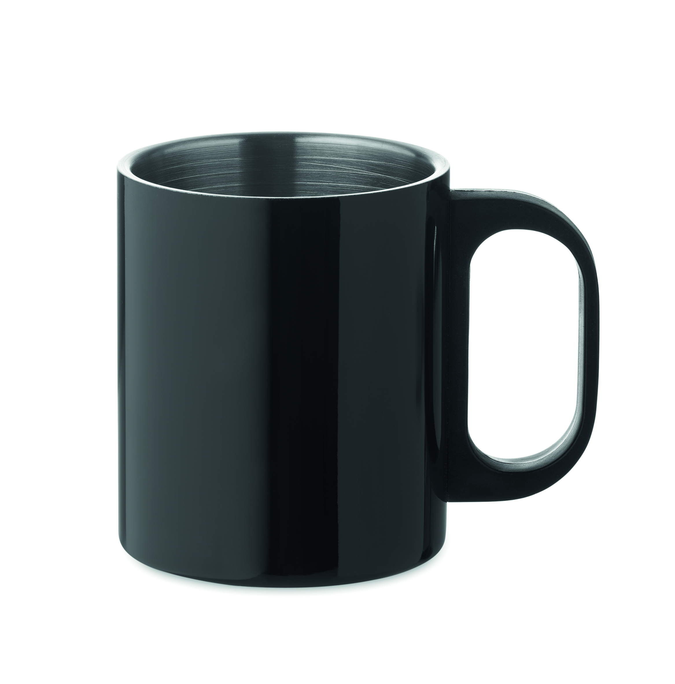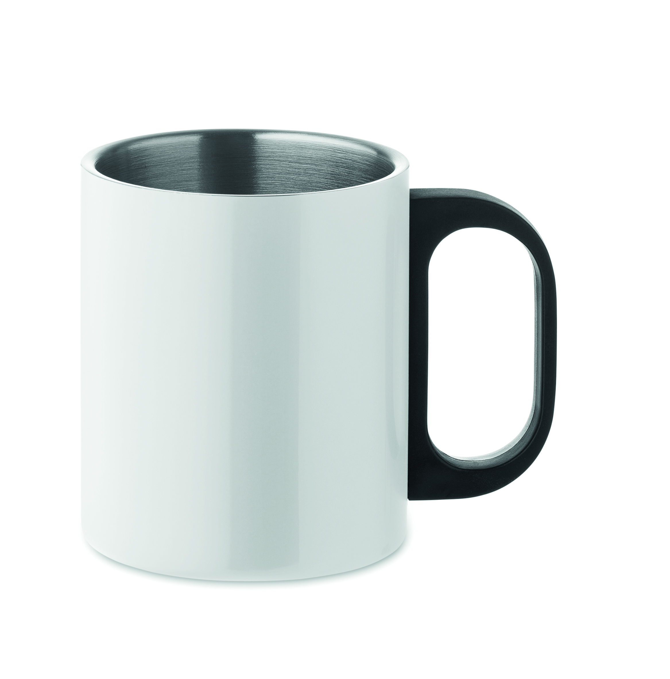 Tasse en acier inoxydable à double paroi avec poignée en PP. Capacité : 300 ml.