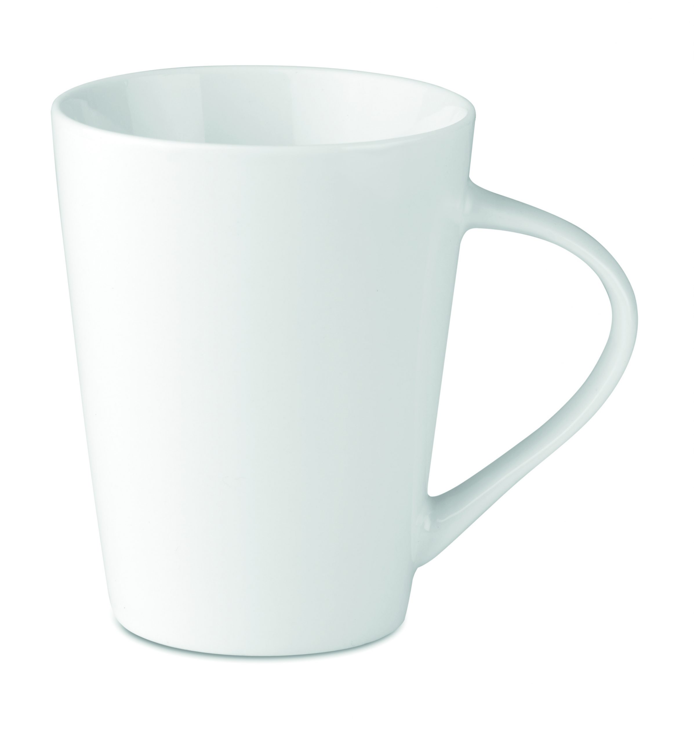 Mug en Porcelaine conique. Contenance: 250 ml. Emballage en vrac. La tampographie ne résiste pas au lave vaisselle. Le transfert céramique est résistant au lavage.