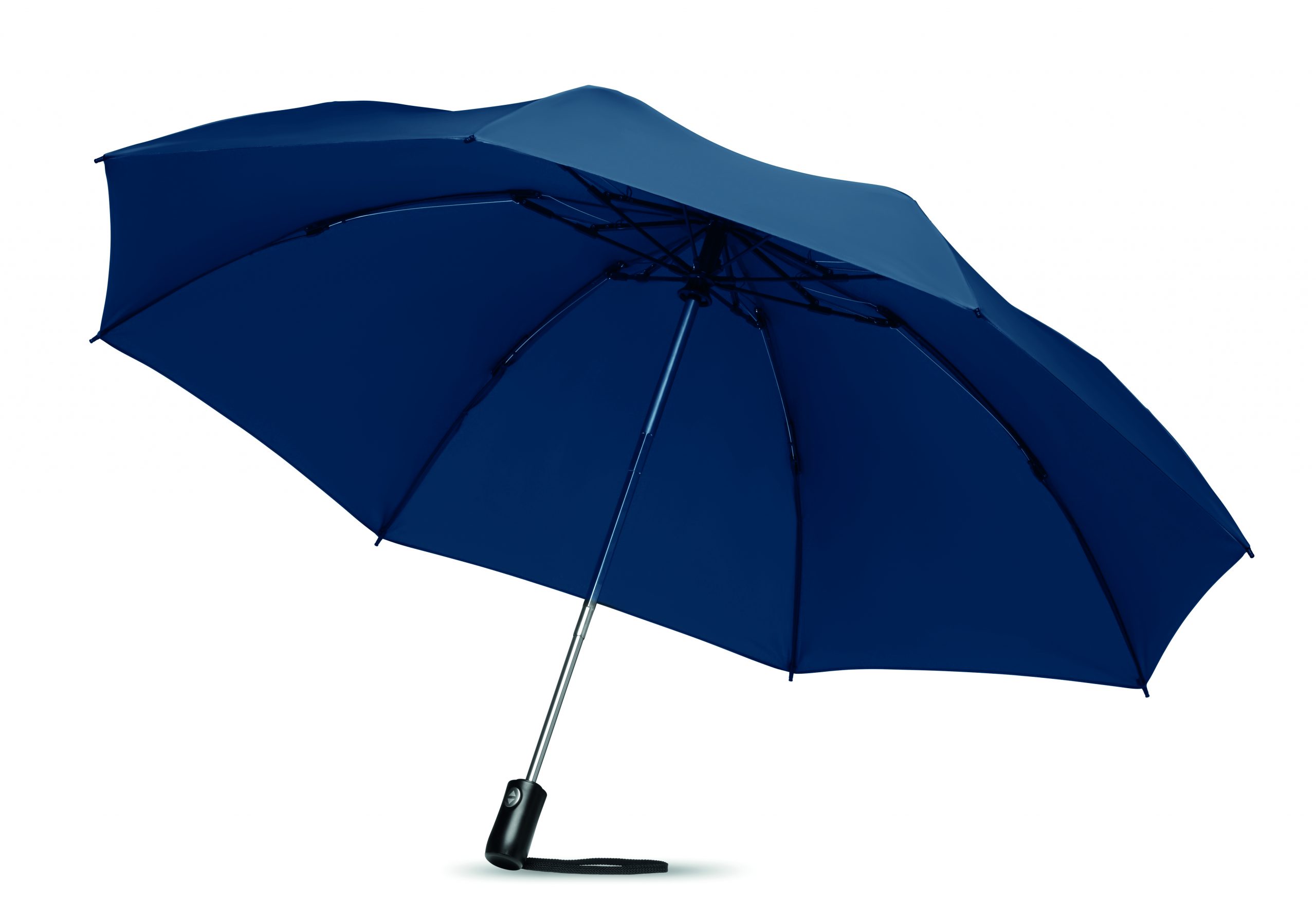 Parapluie 23’’ réversible ouverture/fermeture auto 3 plis en pongé 190T. Mât en acier chromé. Baleines en fibre de verre. Revêtement intérieur noir 1 morceau. Poignée ABS bouton. Pochette assortie.