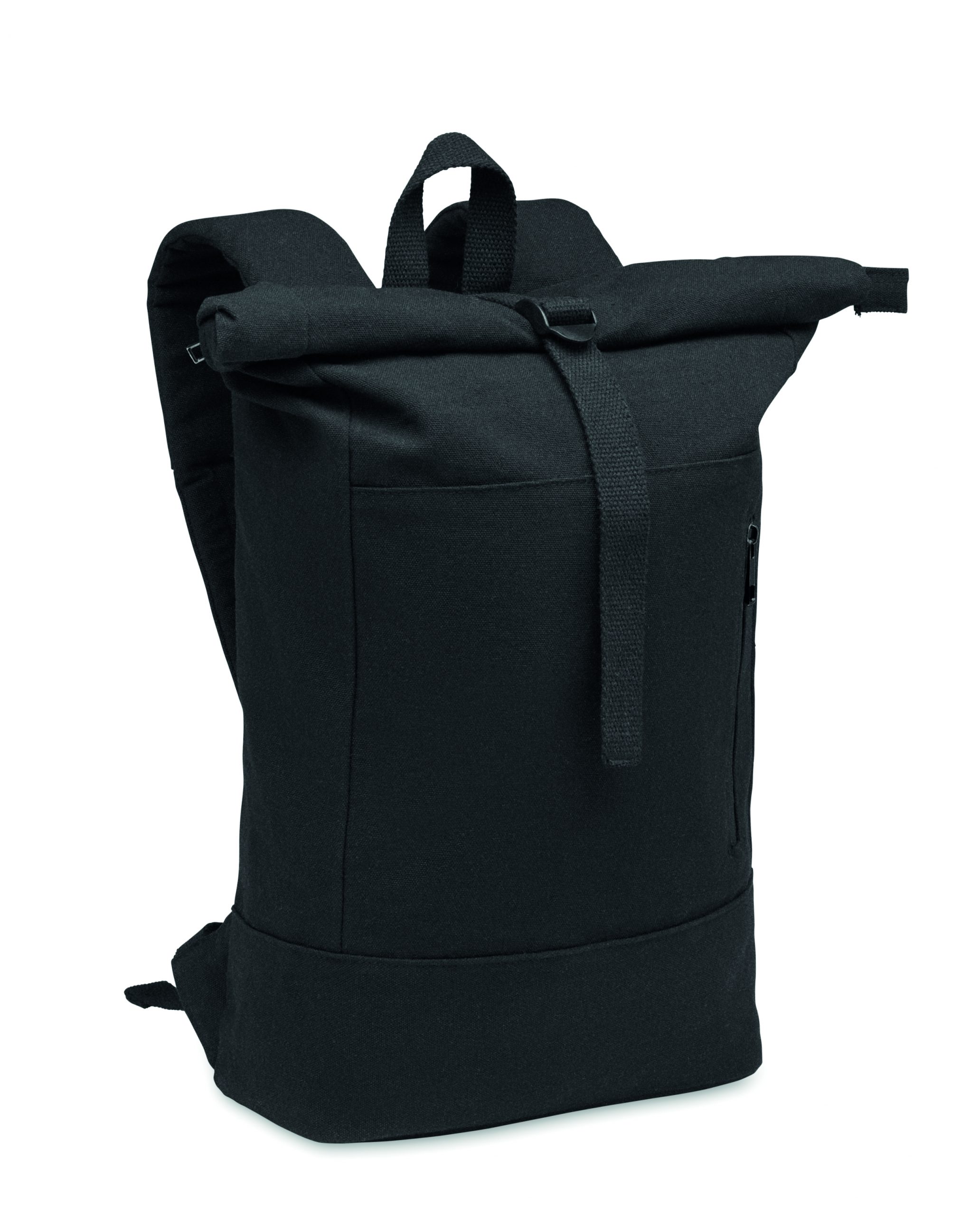 Sac à dos à ftop enroulable zippé pour ordinateur portable de 15 pouces en coton recyclé de préconsommation et polyester recyclé (70 %/30 %). Poche frontale zippée. Dos et bretelles rembourrés. 340gr/m².