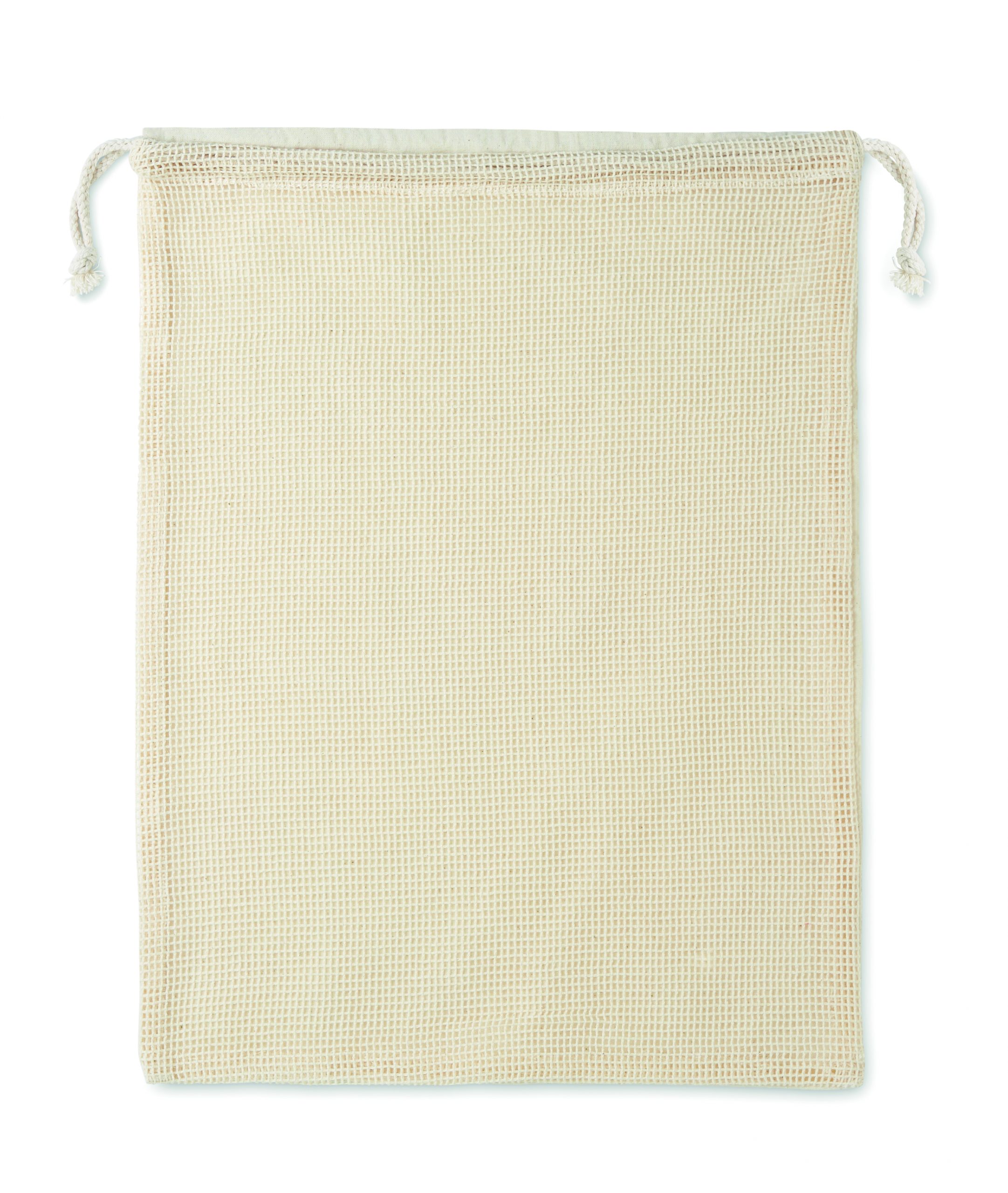 Filet à provisions réutilisable. Un côté est en coton (140gr/m²) et l’autre en filet de coton (110gr/m²). Fermeture par cordon.