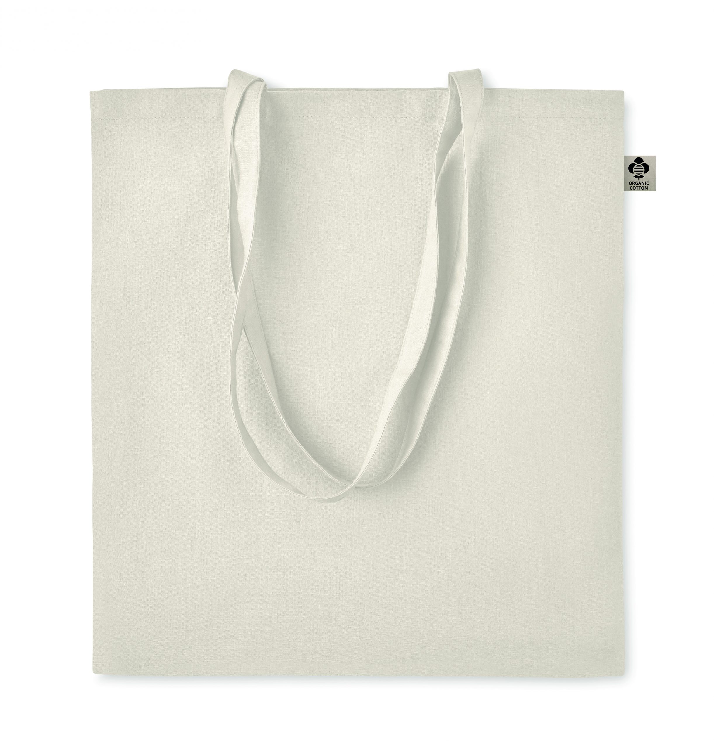 Sac shopping à anses longues en coton organique. 140 gr/m². Produit sous une norme certifiée pour l’utilisation de substances nocives dans le textile.