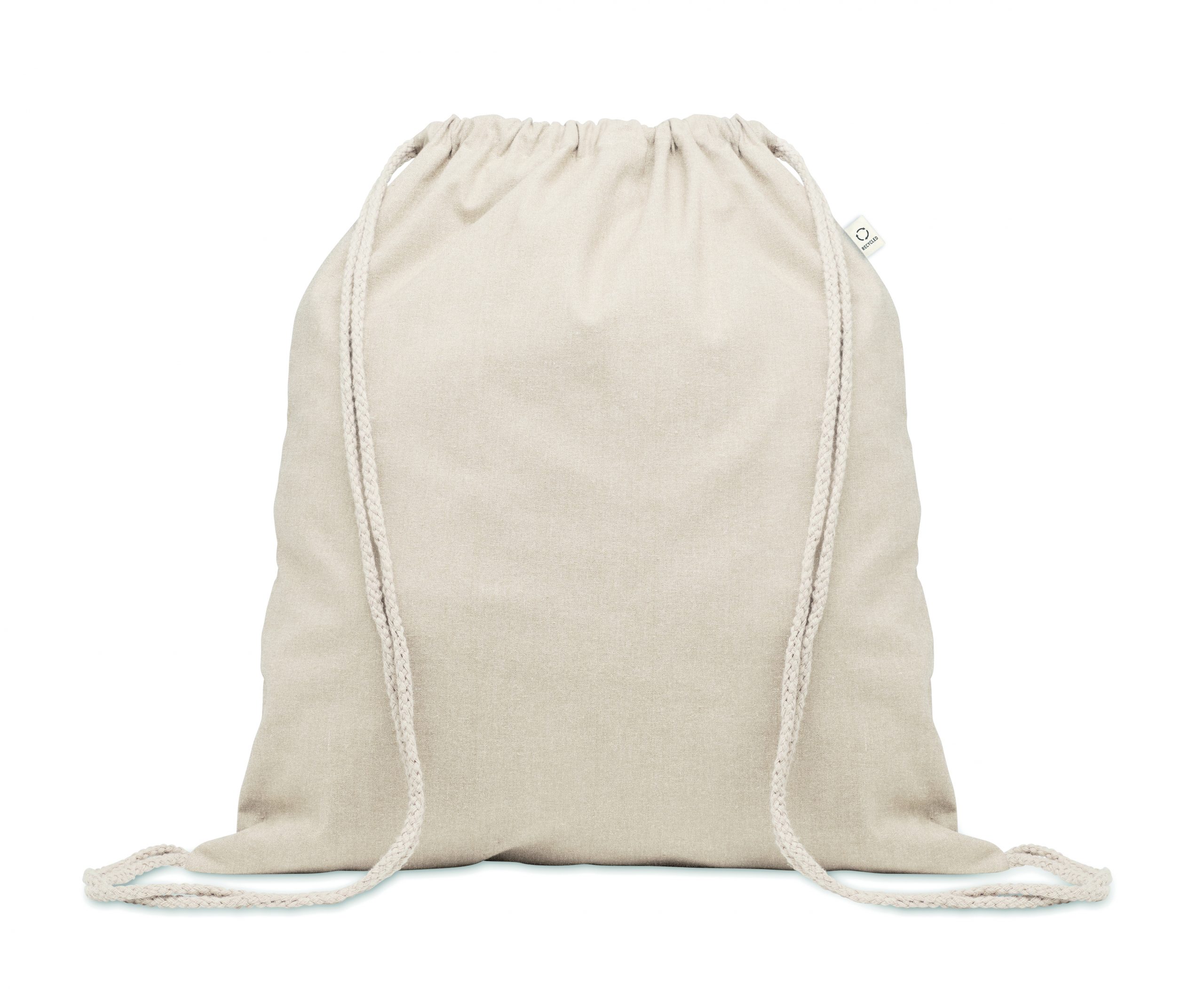 Sac à cordon en coton recyclé pré-consommation (70 %) et RPET (30 %). 140 gr/m². Cet article peut rétrécir après avoir imprimé.