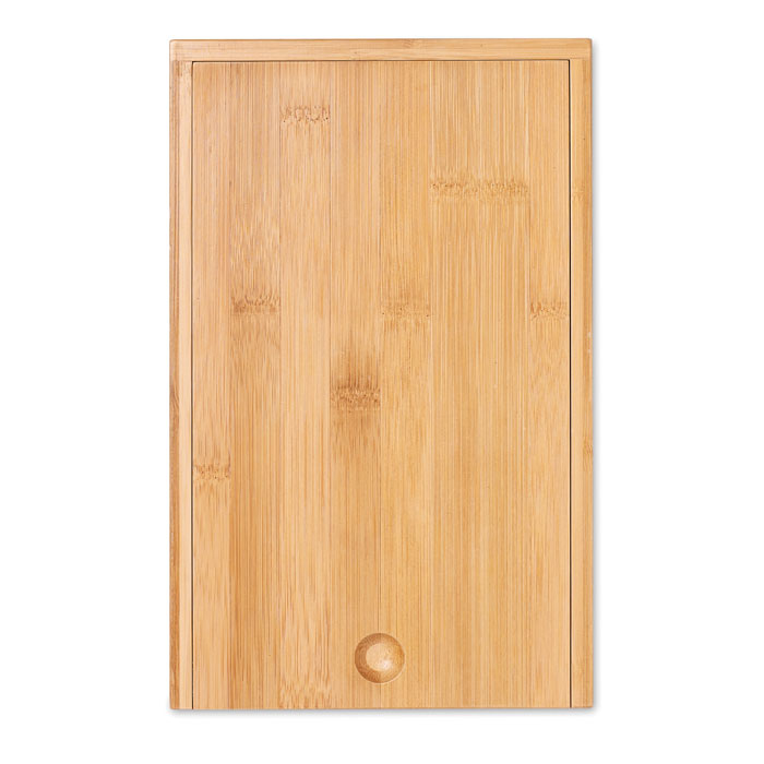 Set à fromage et vin en bambou. Incluant un couteau en acier inox, un couteau-éplucheur à fromage, un ouvre-bouteille et un stop-goutte. Présentés dans une boîte en bambou. Le bambou est un produit naturel, et présente de légères variations de couleur, de décoration et de tailles.