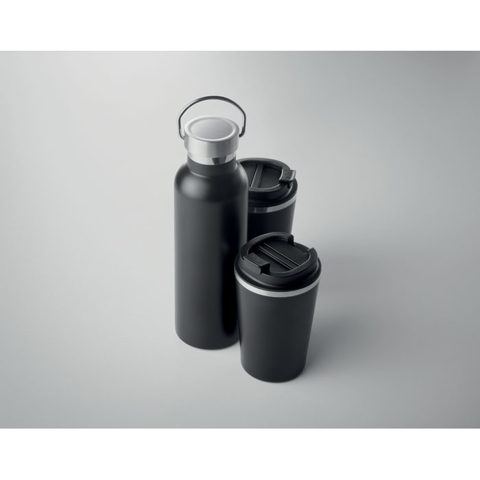 Set de bouteille en acier inoxydable à double paroi (capacité 750 ml), anti fuite avec poignée et 2 gobelets en acier inoxydable (350 ml).