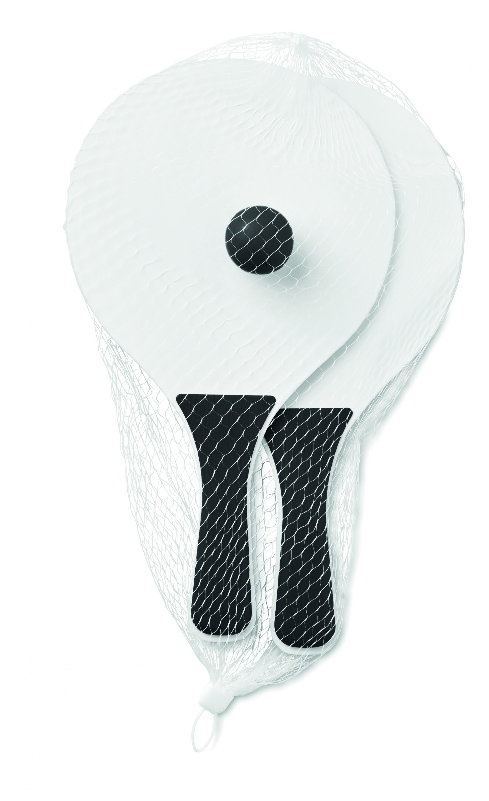 Petit set de tennis de plage constitué de 2 raquettes en MDF et d’une balle souple.