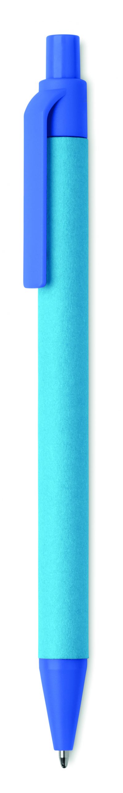Stylo-bille à bouton-poussoir avec le corps en papier et attributs composés à 100% en PLA maïs. Encre bleue.
