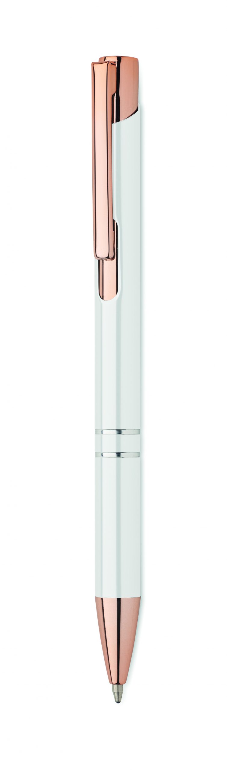 Stylo à bouton poussoir en aluminium recyclé avec détails en façon or rose. Encre bleue.