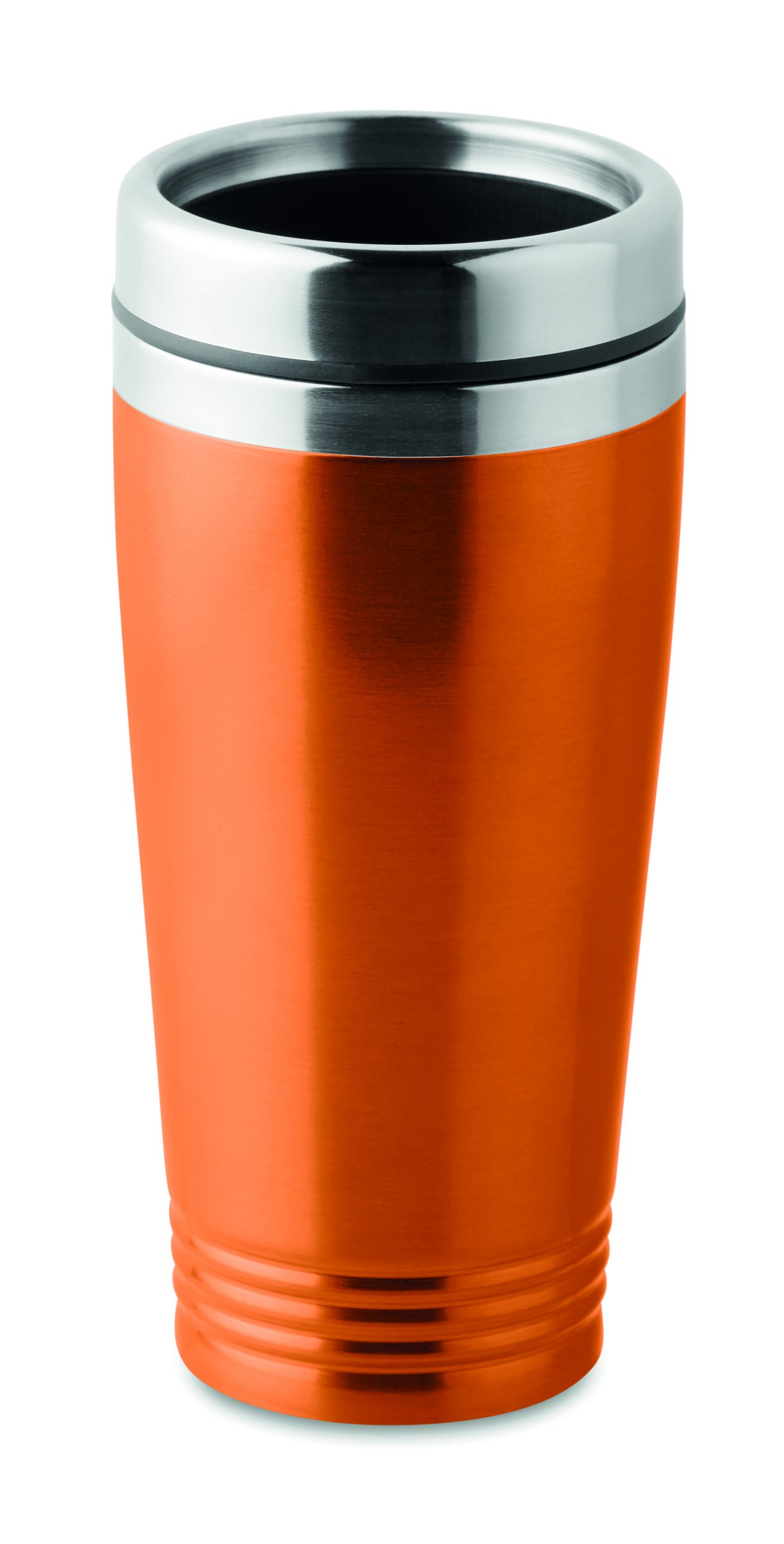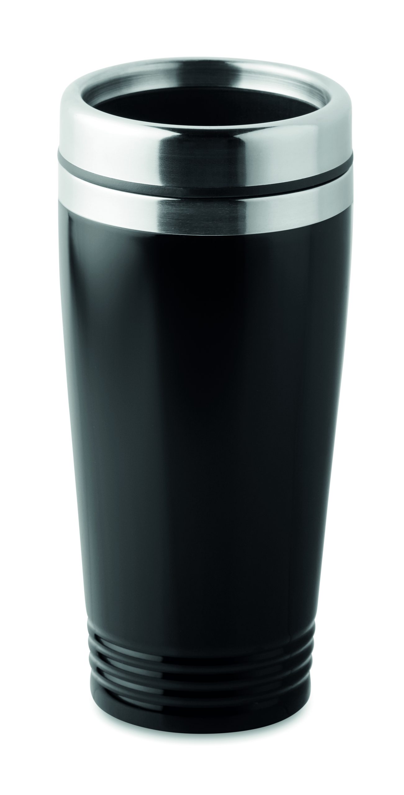 Tasse de voyage à double paroi en acier inoxydable avec couvercle en PP noir. Contenance : 400 ml.